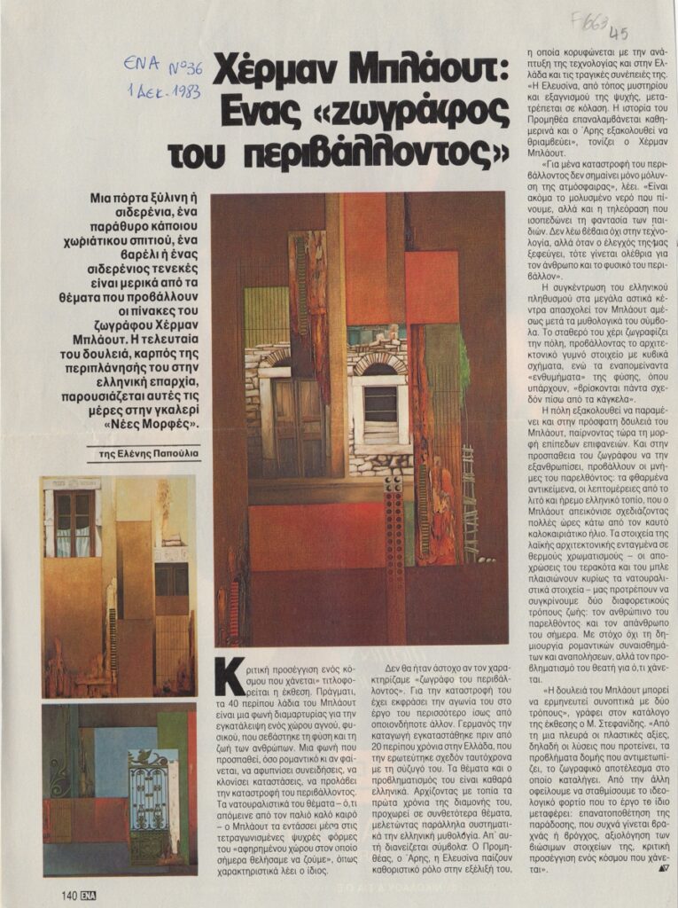 Απόκομμα, χαρτί ιλλουστρασιόν, 30×22 εκ., στα ελληνικά, δημοσίευσης κριτικής έκθεσης του Χέρμαν Μπλάουτ, η οποία διεξάγεται στην Γκαλερί Νέες Μορφές στην Αθήνα.