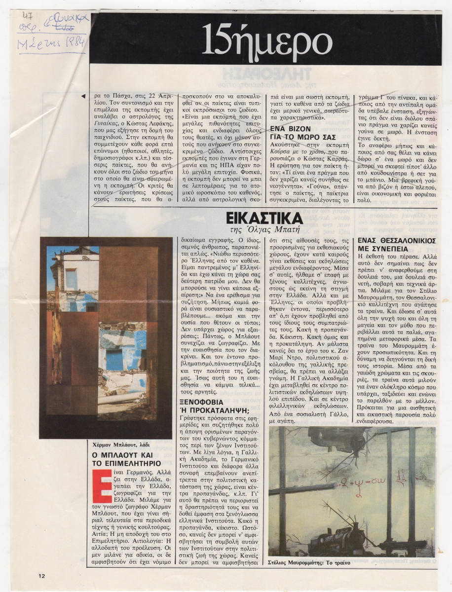 Απόκομμα, χαρτί, 30×22 εκ., στα ελληνικά, δημοσίευσης άρθρου αναφερόμενου στην άρνηση του Επιμελητηρίου Αθηνών να διεξαχθεί εκεί έκθεση του Χέρμαν Μπλάουτ. Το κείμενο εντάσσεται στη στήλη “Εικαστικά” του εντύπου. Στην ίδια στήλη κείμενο με τίτλο “Ξενοφοβία ή προκατάληψη ;”, αναφερόμενο στα ξένα Ινστιτούτα και την πολιτιστική τους δραστηριότητα και κείμενο με τίτλο “Ένας Θεσσαλονικιός με συνέπεια”, αναφερόμενο σε έκθεση του Στέλιου Μαυρομάτη στην Αθήνα.