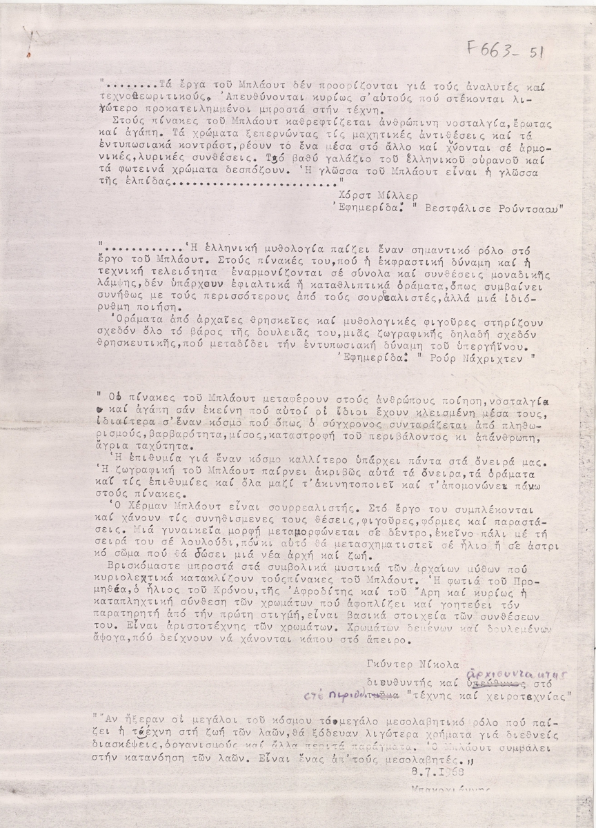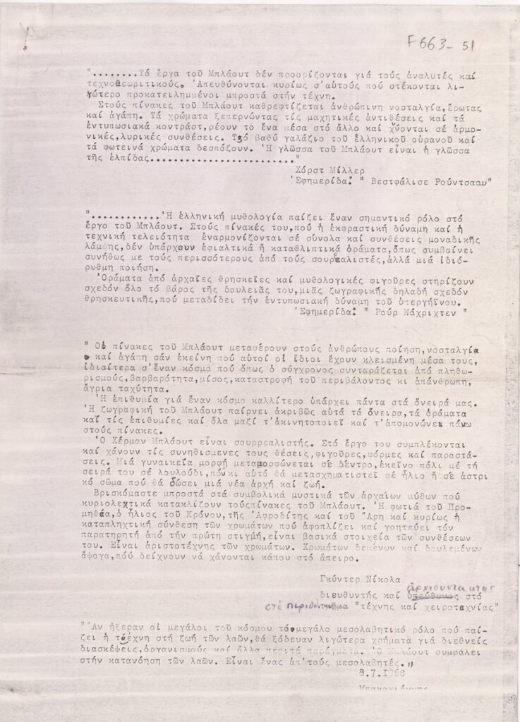 Φωτοαντίγραφο αποδελτιώσεων πηγών, δακτυλόγραφο, χαρτί, 2 φφ, 30×21 εκ., στα ελληνικά. Δίνονται κριτικές για τον καλλιτέχνη και το έργο του από δημοσιεύσεις στον Γερμανικό και Ελληνικό Τύπο.