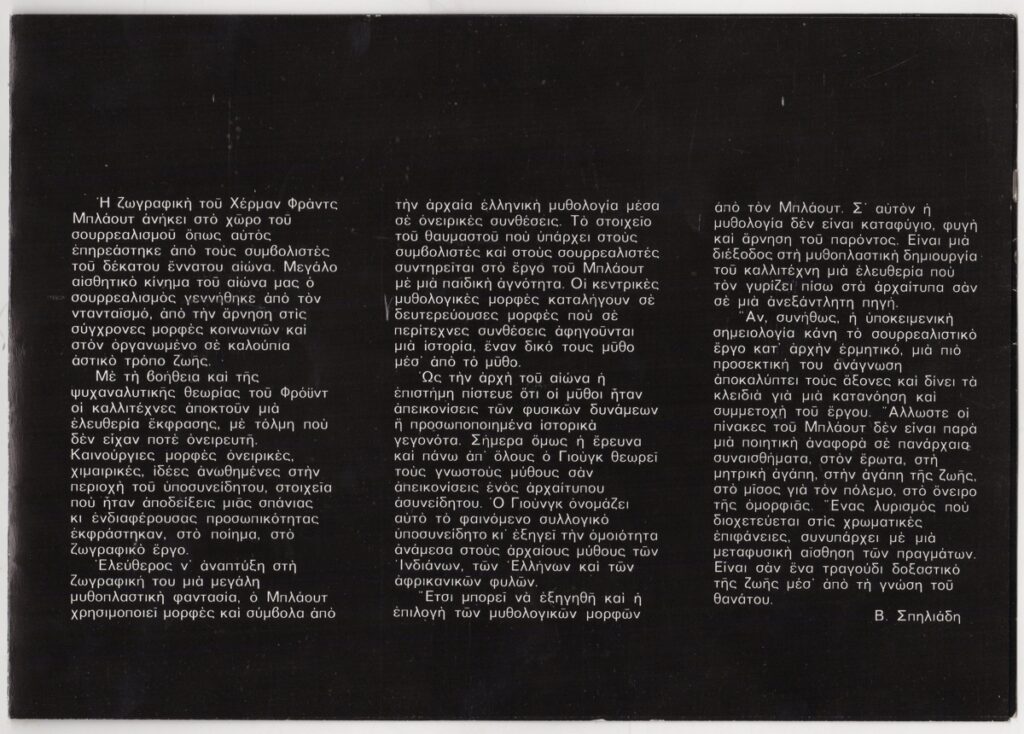 Έντυπο, χαρτόνι αναδιπλωμένο, 17×24 εκ., στα ελληνικά, ατομικής έκθεσης ζωγραφικής του Χέρμαν Μπλάουτ. Περιέχει σύντομο βιογραφικό σημείωμα του καλλιτέχνη, κριτική της Βεατρίκης Σπηλιάδη για το έργο και εικονογράφηση.