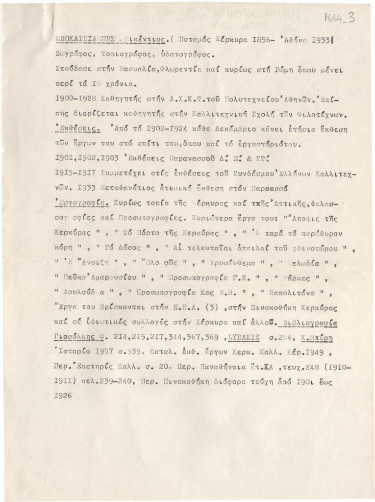 Βιογραφικά στοιχεία για τον ζωγράφο Βικέντιο Μποκατσάμπη. Αναφέρονται σπουδές, εκθέσεις, εργογραφία και βιβλιογραφία για το έργου του.