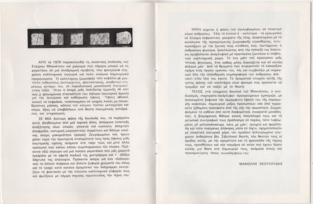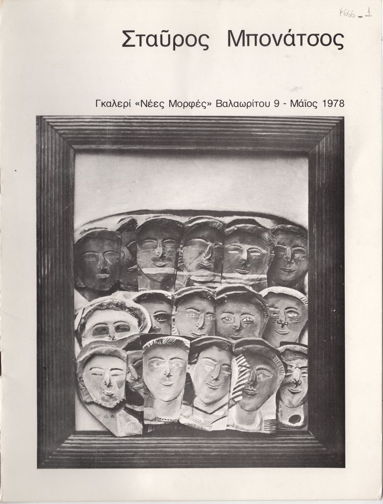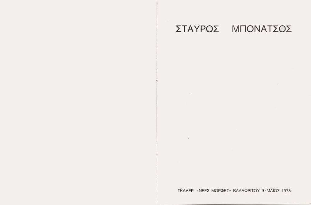 Έντυπο, πολυσέλιδο, στα ελληνικά, χαρτί ιλουστρασιόν και χαρτόνι, 27,0×20,5 εκ. Κατάλογος της ατομικής έκθεσης ζωγραφικής του Σταύρου Μπονάτσου στην Αθήνα το 1978. Περιέχει κείμενο του Μανώλη Σκουλούδη και βιογραφικό καλλιτέχνη. Στο εξώφυλλο και εσωτερικά εικονογράφηση.