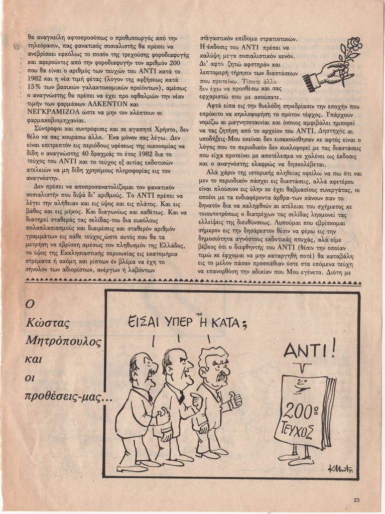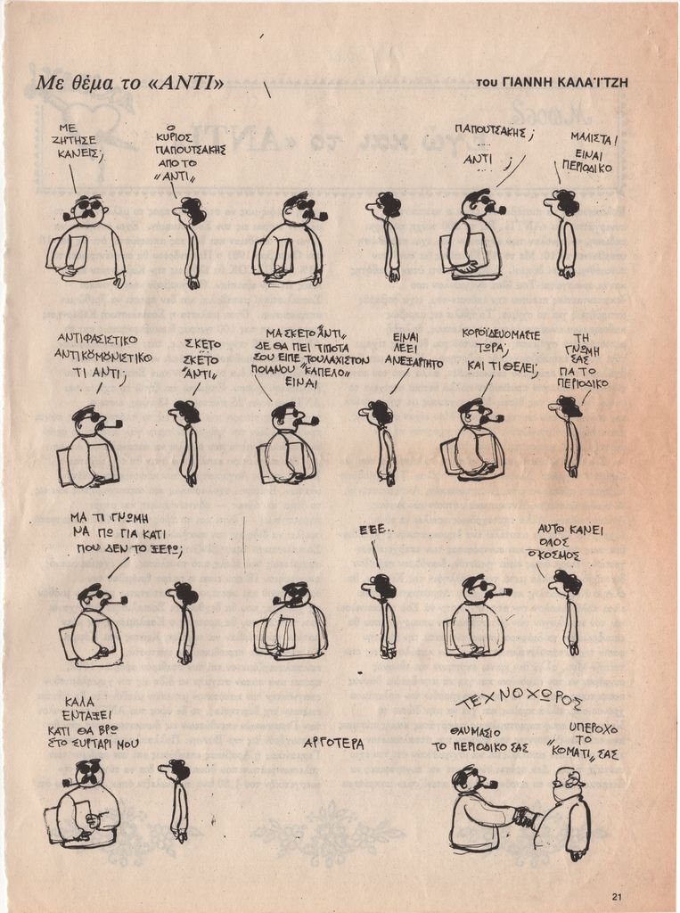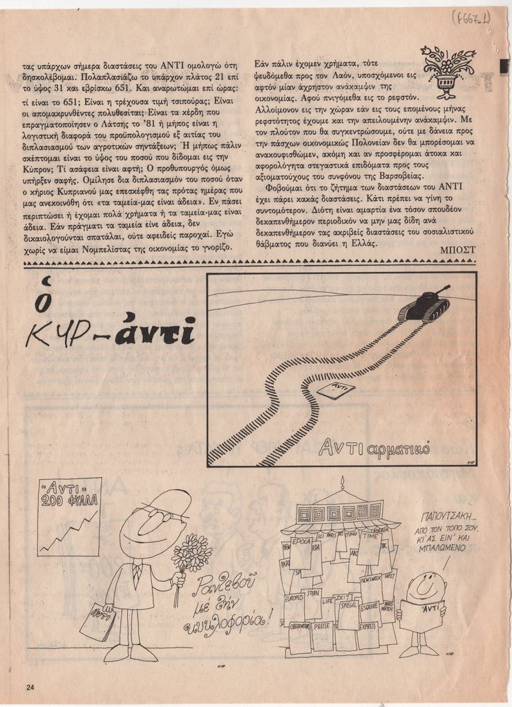 Απόκομμα, έντυπο, χαρτί, 28,2×20,5 εκ., 2 φφ., όπου δημοσιεύεται, στα ελληνικά, κείμενο του Μποστ με τίτλο «Εγώ και το «Αντί». Στο ίδιο απόκομμα δημοσιεύονται επίσης σκίτσα των: ΚΥΡ “Ο Κυρ-Αντί”, του Γιάννη Καλαϊτζή “Με θέμα το Αντί” και του Κώστα Μητρόπουλου “Ο Κώστας Μητρόπουλος και οι προθέσεις μας…”. Στην πρώτη σελίδα, επιγραφή.