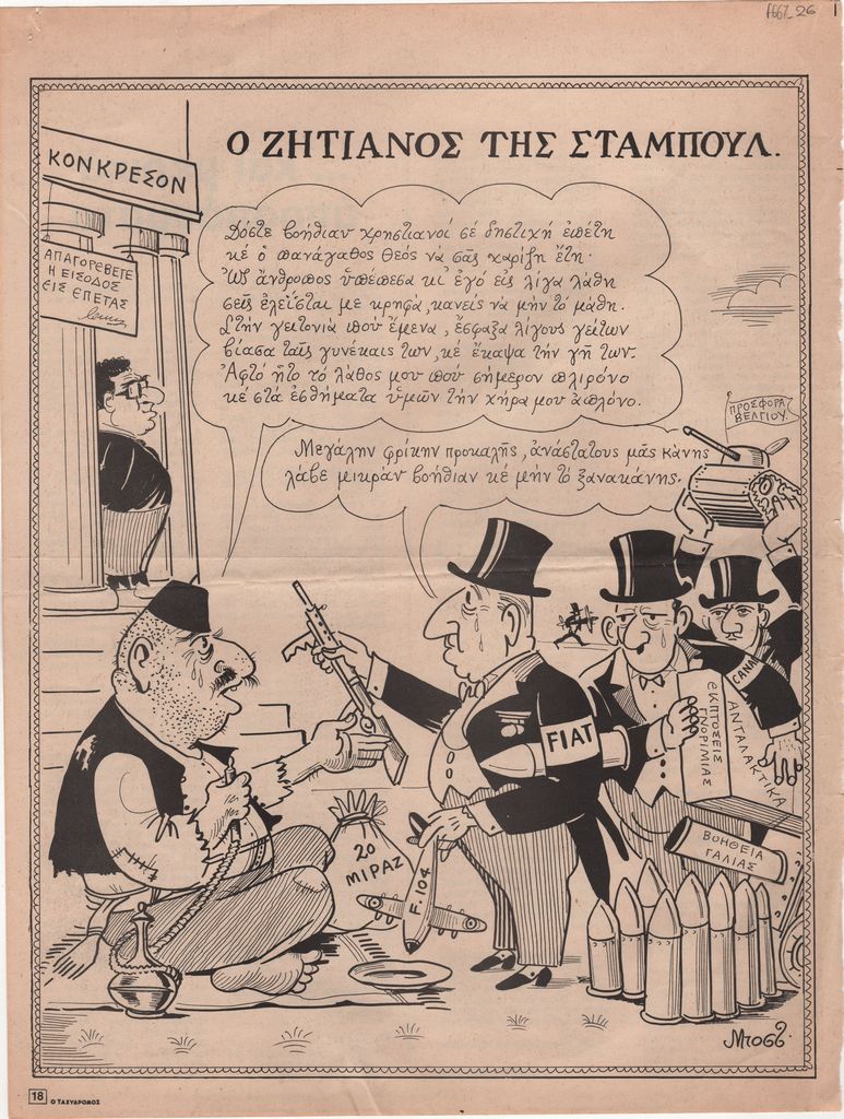 Απόκομμα, έντυπο, χαρτί, 32,4×24,5 εκ., όπου δημοσιεύεται, στα ελληνικά, εικονογραφημένο σατιρικό κείμενο του Μποστ με τίτλο «Ο Ζητιανός της Σταμπούλ». Στην πίσω όψη απόσπασμα άρθρου του Γιάννη Φάτση για την περίοδο της Επταετίας.