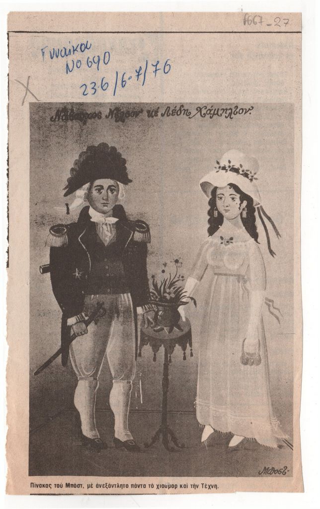 Απόκομμα, έντυπο, χαρτί, 18,0×11,0 εκ., όπου δημοσιεύεται, αναπαραγωγή έργου του Μποστ με τίτλο “Νάβαρχος Νέλσον και Λέδη Χάμηλτον”. Επάνω, χειρόγραφη σημείωση με τα στοιχεία της δημοσίευσης.