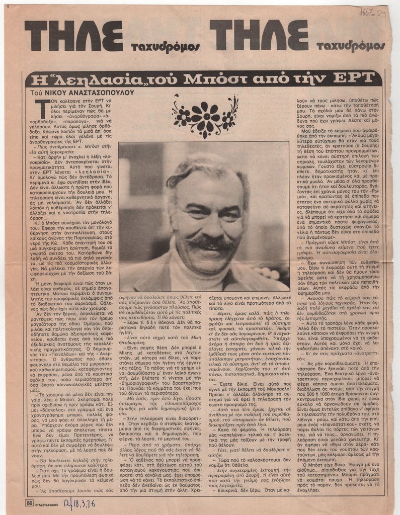 Απόκομμα, έντυπο, χαρτί, 32,0×24,5, όπου δημοσιεύεται, στα ελληνικά, συνέντευξη του Μποστ στον Νίκο Αναστασόπουλο σχετικά με την προβολή τηλεοπτικής εκπομπής στην οποία συμμετείχε ο καλλιτέχνης. Κάτω αριστερά, επιγραφή με τα στοιχεία της δημοσίευσης. Στην πίσω όψη κριτική της τηλεοπτικής επικαιρότητας της περιόδου και γράμματα αναγνωστών.