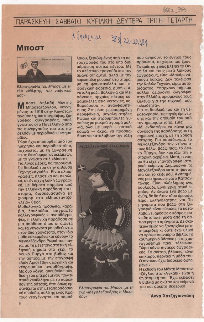 Απόκομμα, έντυπο, χαρτί, 23,3×15,0 εκ., όπου δημοσιεύεται, στα ελληνικά, κριτική της Άννας Χατζηγιαννάκη για την ατομική έκθεση ζωγραφικής του Μποστ στην Αθήνα το 1984. Επάνω, επιγραφή με τα στοιχεία της δημοσίευσης. Στην πίσω όψη θέματα επικαιρότητας.