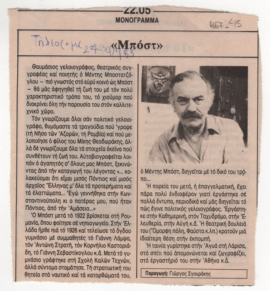 Απόκομμα, έντυπο, χαρτί, 14,1×13,4 εκ., όπου δημοσιεύεται, στα ελληνικά, αναγγελία του τηλεοπτικού αφιερώματος στον Μποστ στα πλαίσια της εκπομπής “Μονόγραμμα”. Εικονογραφείται με αναπαραγωγή φωτογραφίας του καλλιτέχνη. Επάνω, επιγραφή με τα στοιχεία της δημοσίευσης. Στην πίσω όψη, αναγγελία προβολής της ταινίας “Το τεμπελόσκυλο”, παραγωγής του 1963. Εικονογραφείται με α/μ αναπαραγωγή σκηνής της ταινίας με τον Δημήτρη Παπαμιχαήλ.