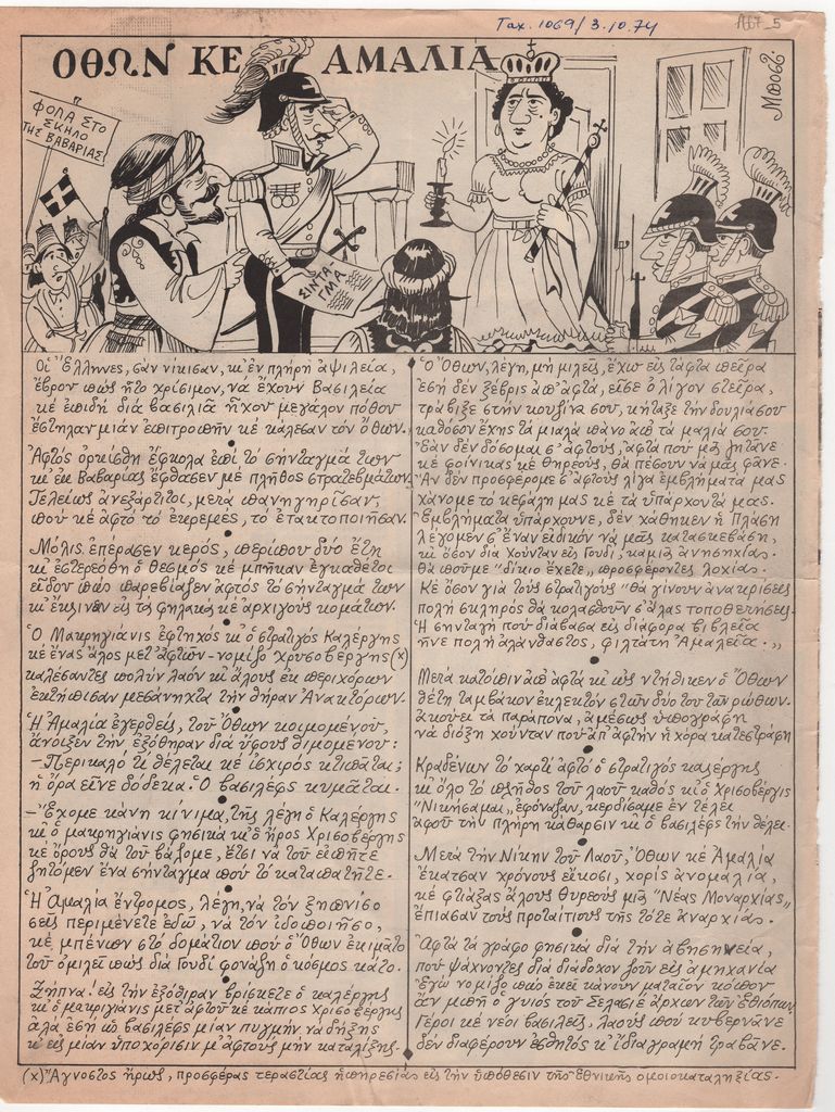 Απόκομμα, έντυπο, χαρτί, 32,5×24,5 εκ., όπου δημοσιεύεται, στα ελληνικά, εικονογραφημένο κείμενο του Μποστ με τίτλο «Όθων κε Αμαλία». Επάνω, επιγραφή με τα στοιχεία της δημοσίευσης. Στην πίσω όψη, φωτογραφικό ρεπορτάζ με τίτλο “Ενας τραυματίας στο πεζοδρόμιο”.