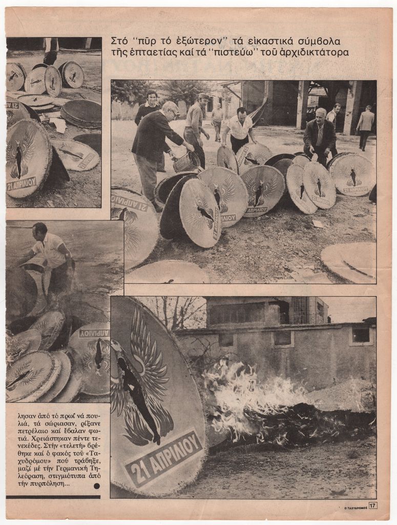 Απόκομμα, έντυπο, χαρτί, 32,5×24,5 εκ., όπου δημοσιεύεται εικονογραφημένο κείμενο του Μποστ με τίτλο «Νάτην, Νάτην! Βουτιέται». Επάνω, σημείωση με τα στοιχεία της δημοσίευσης. Στην πίσω όψη απόσπασμα φωτογραφικού ρεπορτάζ για την καύση των εικαστικών συμβόλων της επταετίας.