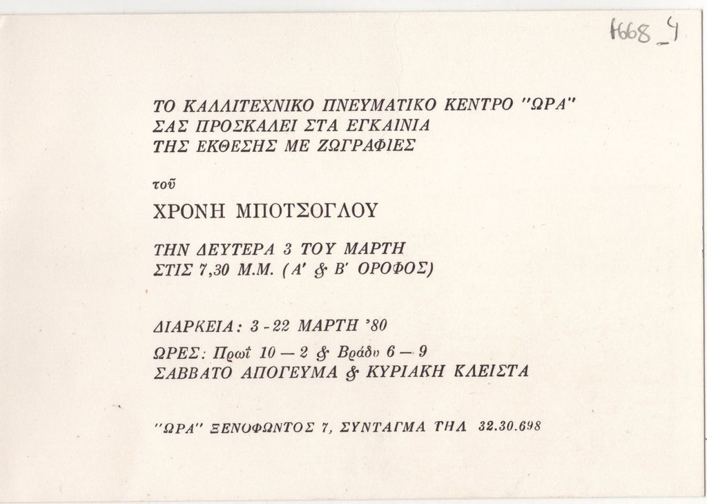 Έντυπο, στα ελληνικά, μονόφυλλο, χαρτόνι, 11,0×16.0 εκ. Πρόσκληση εγκαινίων της ατομικής έκθεσης ζωγραφικής του Χρόνη Μπότσογλου στην Αθήνα το 1980.