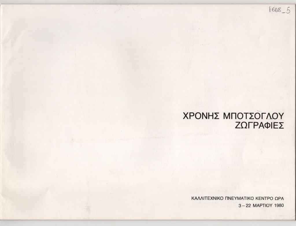 Έντυπο, στα ελληνικά, πολυσέλιδο, χαρτί, 21,0×28,5 εκ. Κατάλογος της ατομικής έκθεσης ζωγραφικής του Χρόνη Μπότσογλου στην Αθήνα το 1980. Περιέχει σύντομο κείμενο του Διαμαντή Διαμαντόπουλου για το έργο του καλλιτέχνη, σύντομο βιογραφικό καλλιτέχνη και αναπαραγωγές έργων. Οι φωτογραφίες και η μακέτα της αφίσας είναι του Στέλιου Σκοπελίτη.
