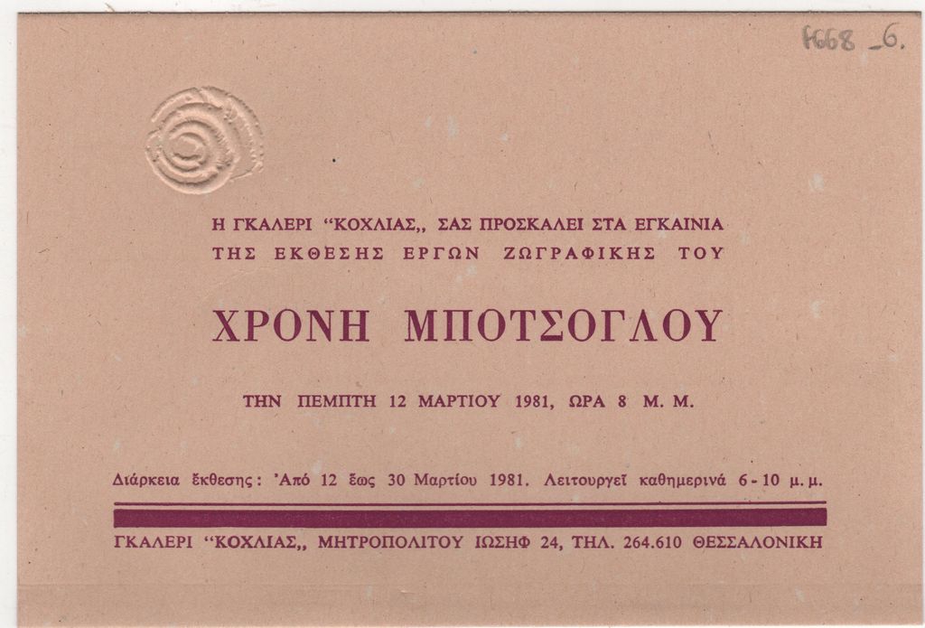 Έντυπο, στα ελληνικά, μονόφυλλο, χαρτόνι, 11,2×16,2 εκ. Πρόσκληση εγκαινίων τηςατομικής έκθεσης ζωγραφικής του Χρόνη Μπότσογλου στη Θεσσαλονίκη το 1981.