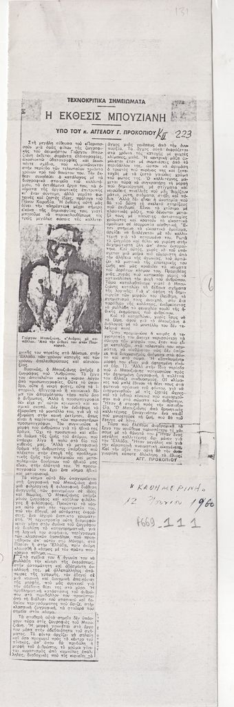 Φωτοαντίγραφο αποκόμματος, χαρτί, 29,8×9,5 εκ., όπου δημοσιεύεται, στα ελληνικά, κριτική του Άγγελου Γ. Προκοπίου για την αναδρομική έκθεση έργων του ζωγράφου Γιώργου Μπουζιάνη στην Αθήνα το 1960. Κάτω δεξιά, επιγραφή με τα στοιχεία της δημοσίευσης.