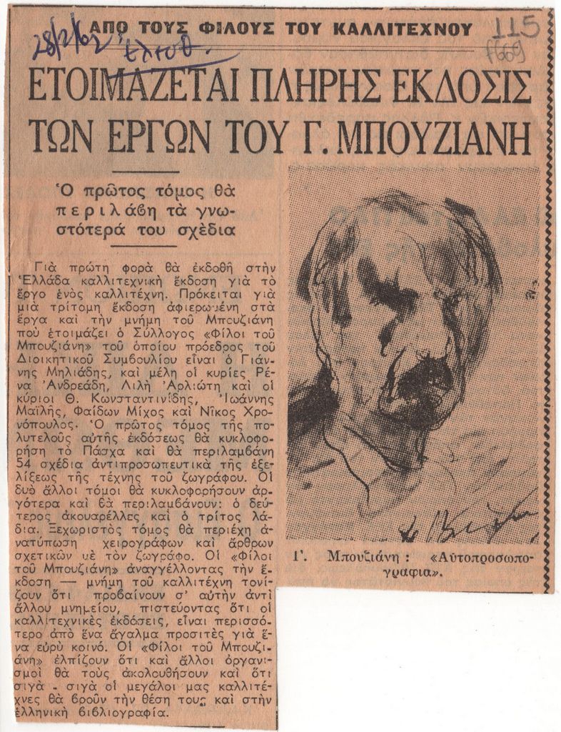 «Από τους φίλους του καλλιτέχνου ετοιμάζεται πλήρης έκδοσις των έργων του Γ. Μπουζιάνη»