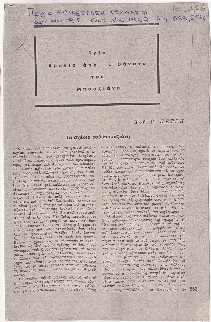 Φωτοαντίγραφο αποκομμάτων, χαρτί, 2 τμήματα, 24,2×15,7 και 16,4×15,8 εκ., όπου δημοσιεύεται, στα ελληνικά, άρθρο του Γ. Πετρή για το έργο του ζωγράφου Γιώργου Μπουζιάνη με αφορμή τη συμπλήρωση τριών χρόνων από τον θάνατό του. Στην πρώτη σελίδα, επιγραφή με τα στοιχεία της δημοσίευσης.