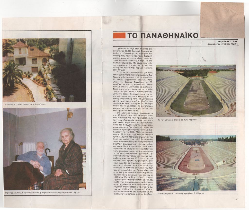Απόκομμα, έντυπο, χαρτί ιλουστρασιόν, 27,4×34,0 εκ., όπου δημοσιεύεται, στα ελληνικά, άρθρο της αρχαιολόγου Αθηνάς Σχινά για το Παναθηναϊκό Στάδιο στην Αθήνα. Στην πίσω όψη άρθρο της Ευρυδίκης Trichon-Μιλσανή για την έκθεση έργων του Γιώργου Μπουζιάνη στο πλαίσιο της διοργάνωσης Europalia.