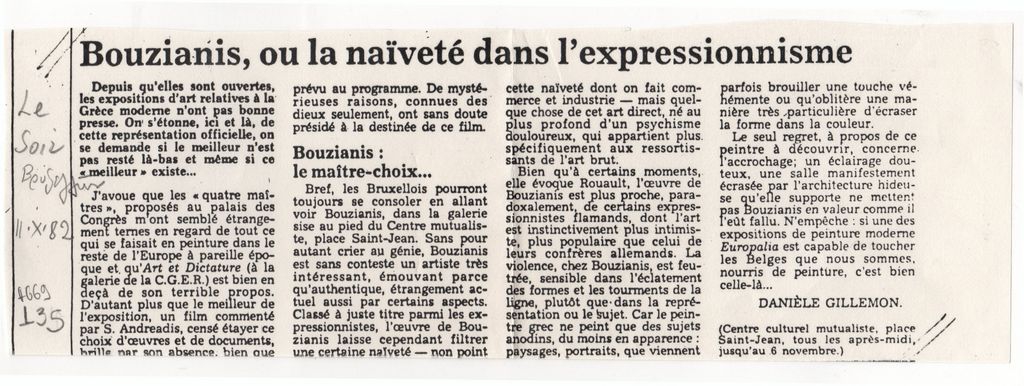 Φωτοαντίγραφο αποκόμματος, χαρτί, 8,4×25,0 εκ., όπου δημοσιεύεται άρθρο της D. Gillemon για την αναδρομική έκθεση έργων του Γιώργου Μπουζιάνη στο Centre Culturel mutualiste στις Βρυξέλλες το 1982. Αριστερά, επιγραφή με τα στοιχεία της δημοσίευσης.