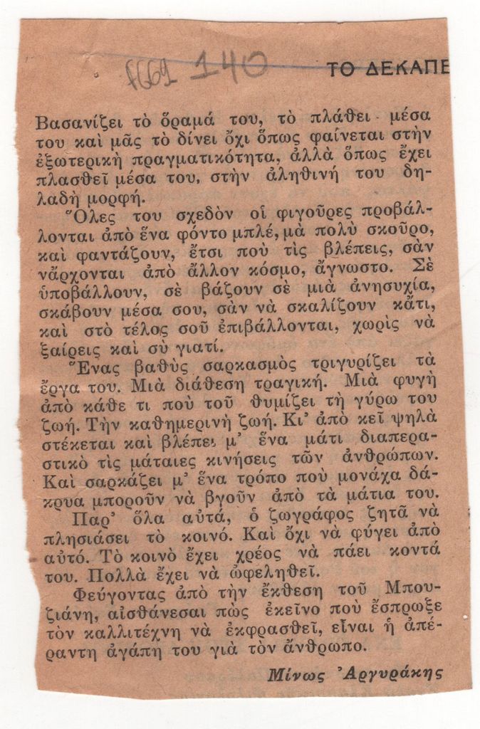 Απόκομμα, έντυπο, χαρτί, 11,0×7,0 εκ., όπου δημοσιεύεται, στα ελληνικά, κριτική του Μίνου Αργυράκη για το έργο του Γιώργου Μπουζιάνη με αφορμή έκθεση του καλλιτέχνη.