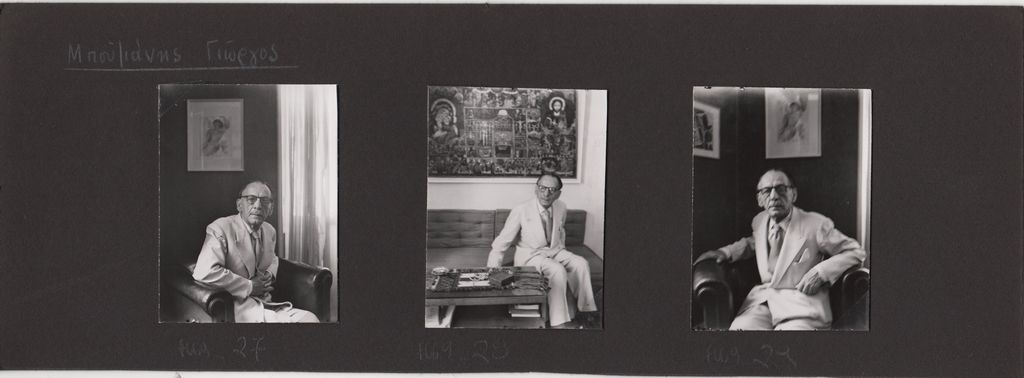 Φωτογραφίες, α/μ, σε φωτογραφικό χαρτί, 6,0×4,5 εκ., επικολλημένες σε χαρτόνι, μαύρο, 9,0×25,0. Κόντακτ με τρία φωτογραφικά πορτραίτα του ζωγράφου Γιώργου Μπουζιάνη. Στην επιφάνεια του χαρτονιού επιγραφή.