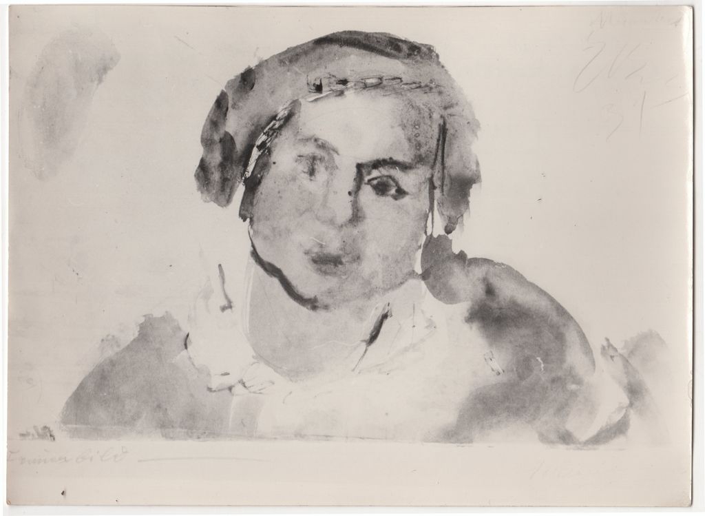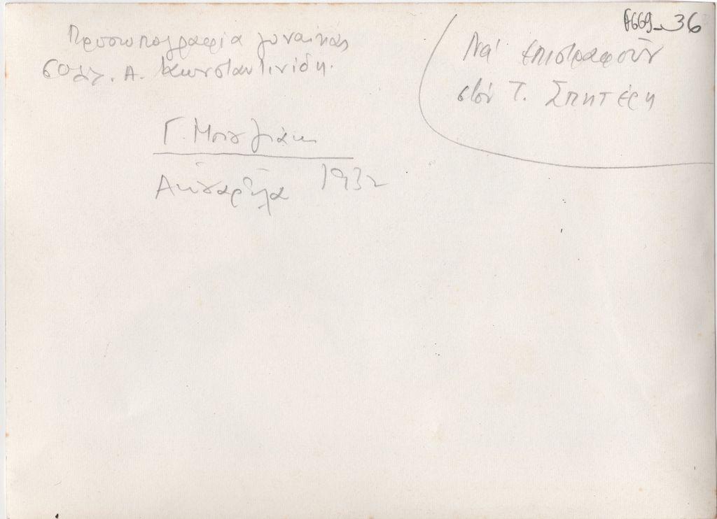 Φωτογραφία, α/μ, σε φωτογραφικό χαρτί, 13,2×18,0 εκ. Αναπαραγωγή έργου του Γιώργου Μπουζιάνη με τίτλο «Προσωπογραφία γυναίκας», 1932. Στην πίσω όψη επιγραφή με τα στοιχεία του έργου.