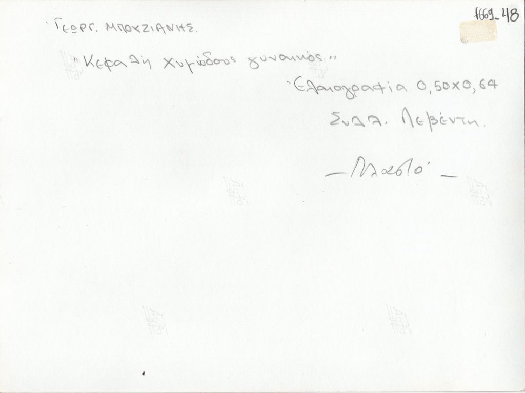 Φωτογραφία, α/μ, σε φωτογραφικό χαρτί, 13,7×17,2 εκ. Αναπαραγωγή έργου του Γιώργου Μπουζιάνη με τίτλο «Κεφαλή χυμώδους γυναικός», ελαιογραφία. Στην πίσω όψη επιγραφή με τα στοιχεία του έργου και τη σημείωση “πλαστό”.