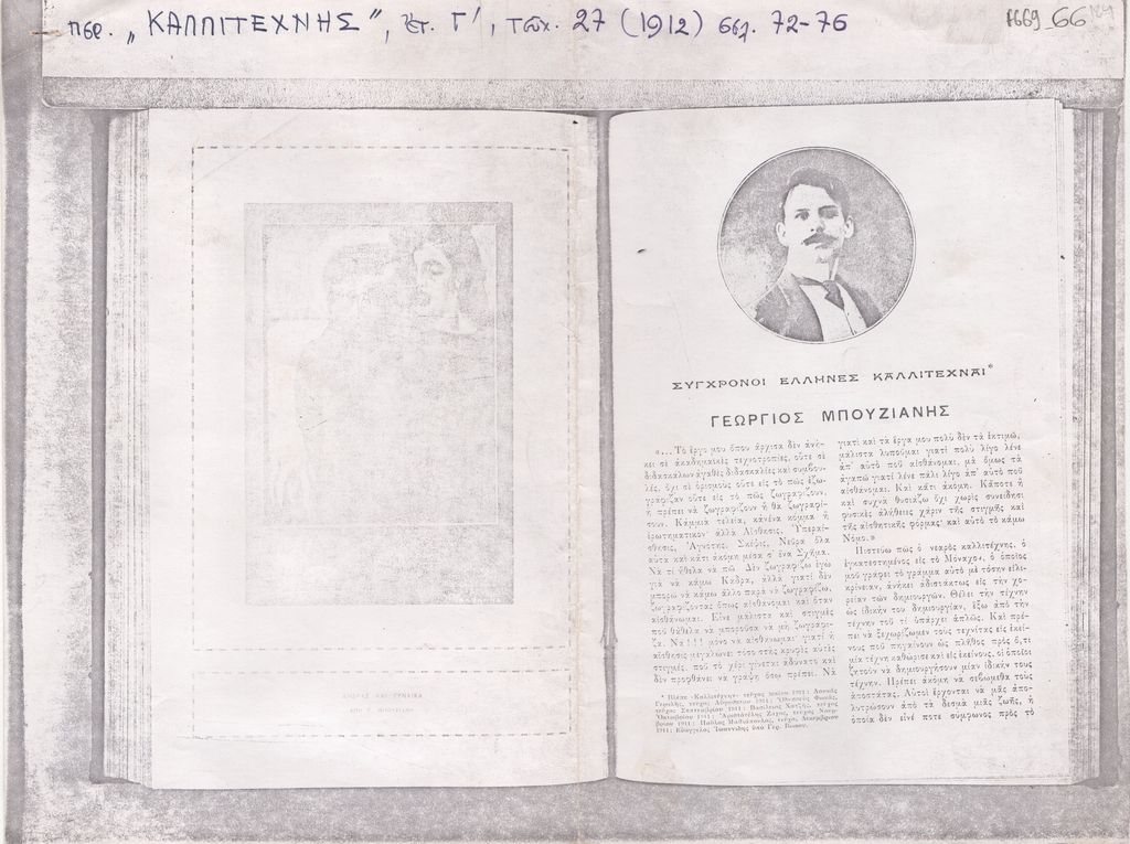Φωτοαντίγραφο αποκόμματος, έντυπο, χαρτί, 4 φφ., 21,7×28,0 εκ., όπου δημοσιεύεται, στα ελληνικά, άρθρο του Γερ. Βώκου για τον ζωγράφο Γεώργιο Μπουζιάνη. Εικονογραφείται με αναπαραγωγές έργων. Στο τελευταίο φύλλο δημοσιεύονται επίσης δύο ποιήματα του Χάρη Επαχτίτη με τίτλο “Αγγελόκρουμα” και “Αποθυμιά” και απόσπασμα διηγήματος του Αλέξανδρου Παπαδιαμάντη με τίτλο “Τα Βενετικα”. Στην πρώτη σελίδα, επιγραφή με τα στοιχεία της δημοσίευσης.