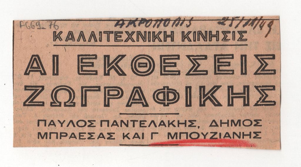 Απόκομμα, έντυπο, χαρτί, 4,5×9,5 εκ., όπου δημοσιεύεται κριτική των εκθέσεων του Παύλου Παντελάκη, του Δήμου Μπράεσα και του Γιώργου Μπουζιάνη το 1949. Έχει αποδελτιωθεί μόνο ο τίτλος του δημοσιεύματος.