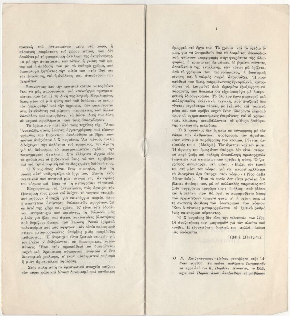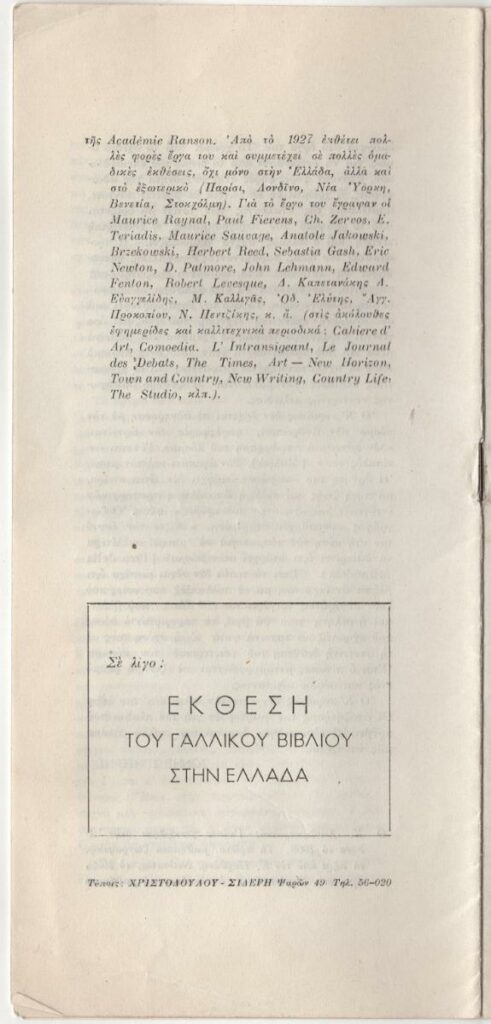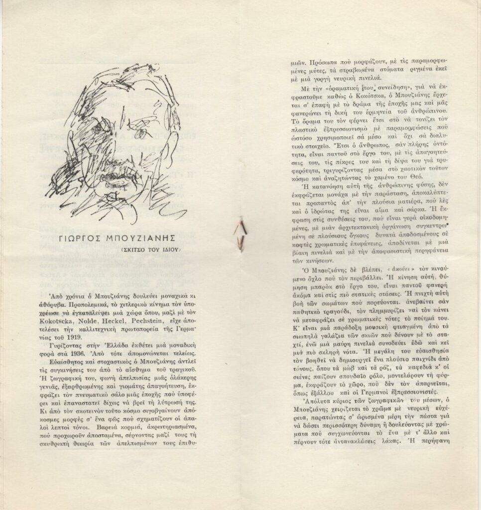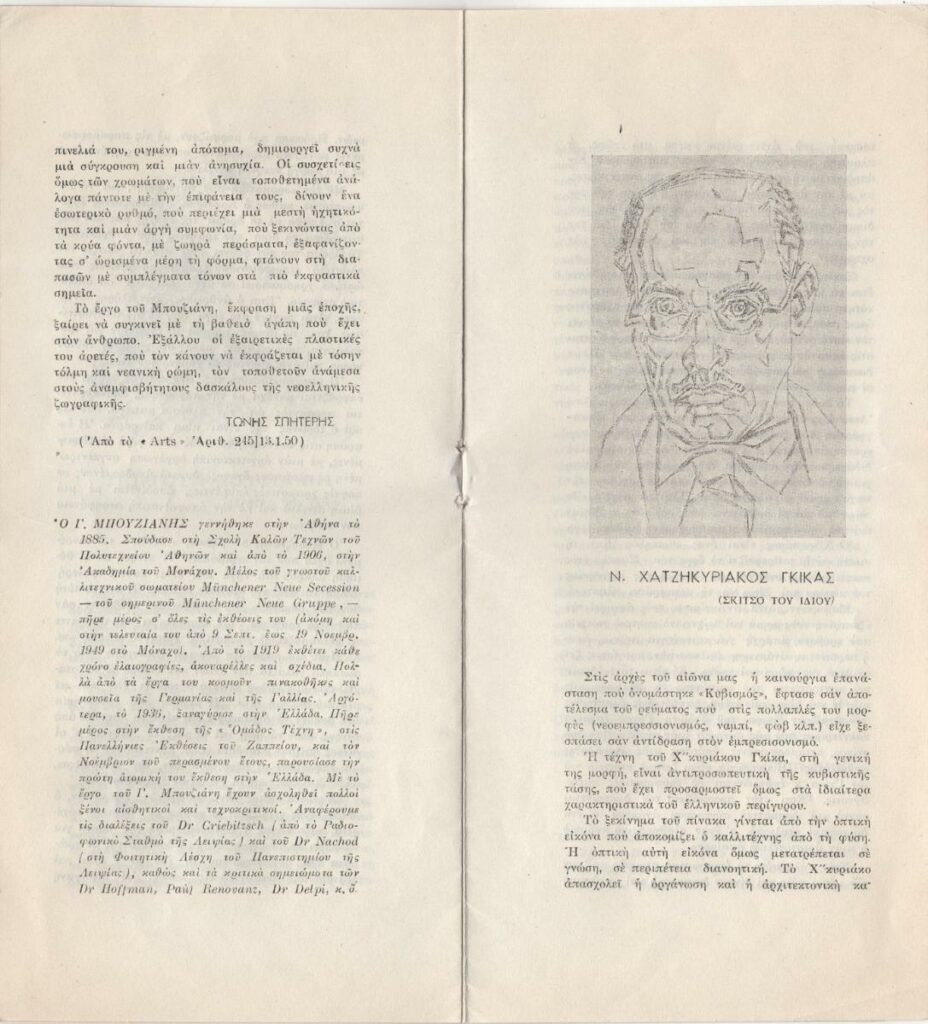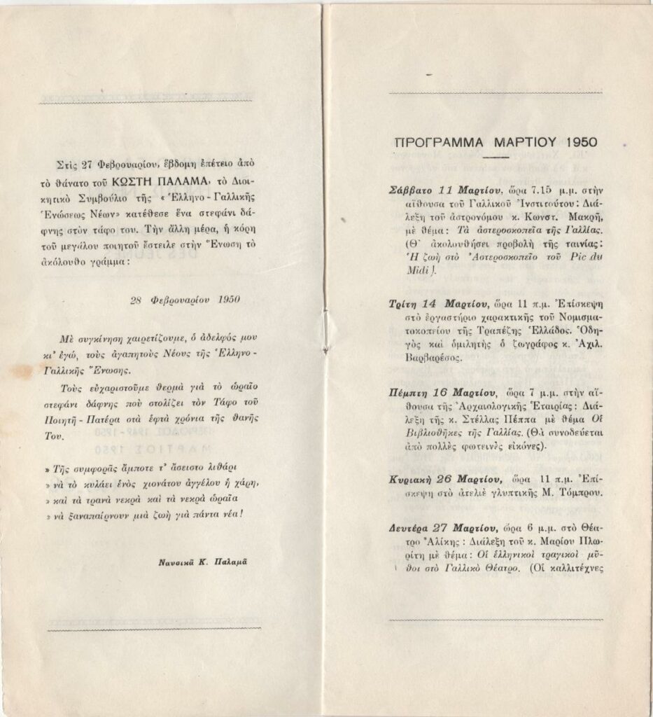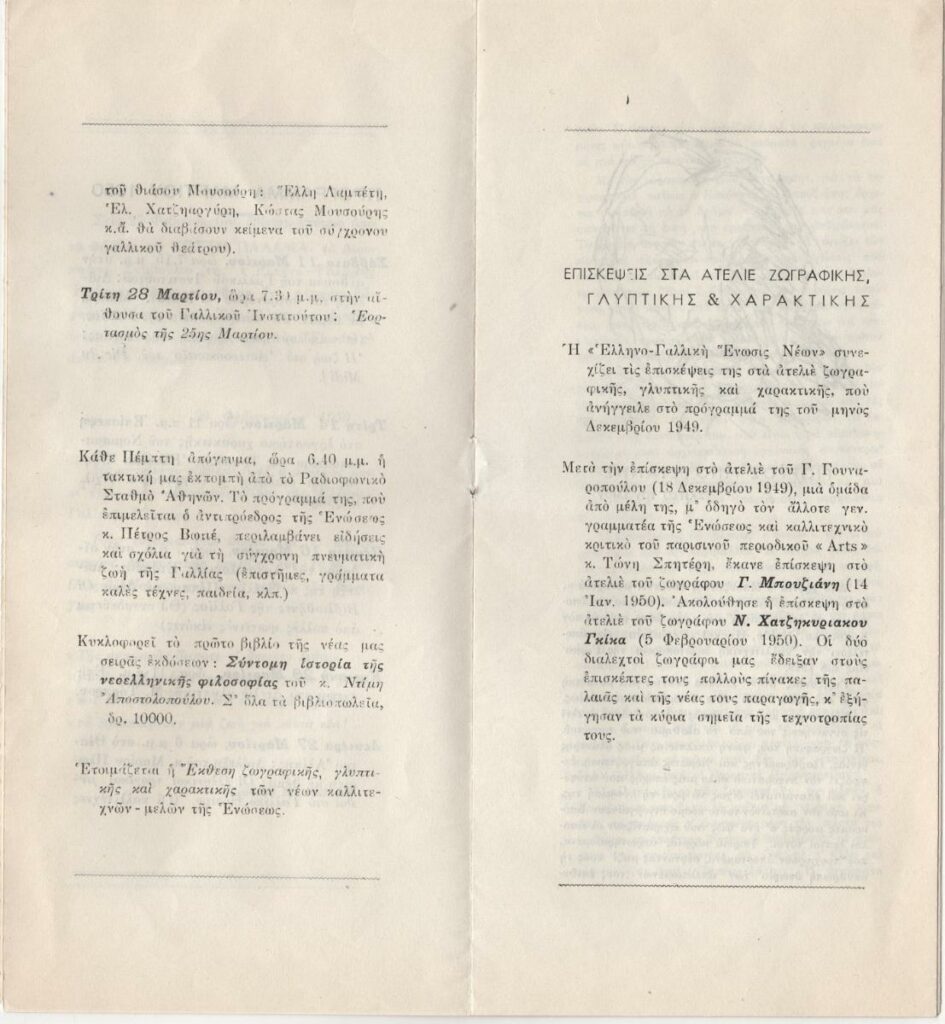 Έντυπο, στα ελληνικά και γαλλικά, πολυσέλλιδο, 24,0×11,0 εκ. Πρόγραμμα της Ελληνο-Γαλλικής Ενώσεως Νέων για τον Μάρτιο του 1950. Αναφέρονται : Κατάθεση στεφάνων στη μνήμη του Κωστή Παλαμά, ξενάγηση στο εργαστήριο χαρακτικής του Νομισματοκοπείου της Τραπέζης Ελλάδος με ομιλητή τον ζωγράφο Α. Βαρβαρέσο, επίσκεψη στο ατελιέ του Μ. Τόμπρου, ομιλία του Μάριου Πλωρίτη με θέμα “Οι ελληνικοί μύθοι στο Γαλλικό θέατρο” με συμμετοχή των Ε. Λαμπέτη, Ε. Χατζηαργύρη και Κ. Μουσούρη. Ιδιαίτερη αναφορά γίνεται στην επίσκεψη των μελών της ένωσης στα ατελιέ του Γ. Μπουζιάνη και του Ν. Χατζηκυριάκου Γκίκα με οδηγό τον Τώνη Σπητέρη. Στο πρόγραμμα δημοσιεύεται μεταφρασμένο στα ελληνικά του άρθρο του Τώνη Σπητέρη για τον Γιώργο Μπουζιάνη από το περιοδικό ARTS, τ. 245, 13/01/1950 και κείμενο του Τώνη Σπητέρη για τον Ν. Χατζηκυριάκο Γκίκα. Περιλαμβάνονται σύντομα βιογραφικά σημειώματα των δύο καλλιτεχνών. Εικονογραφείται με αναπαραγωγή έργων.