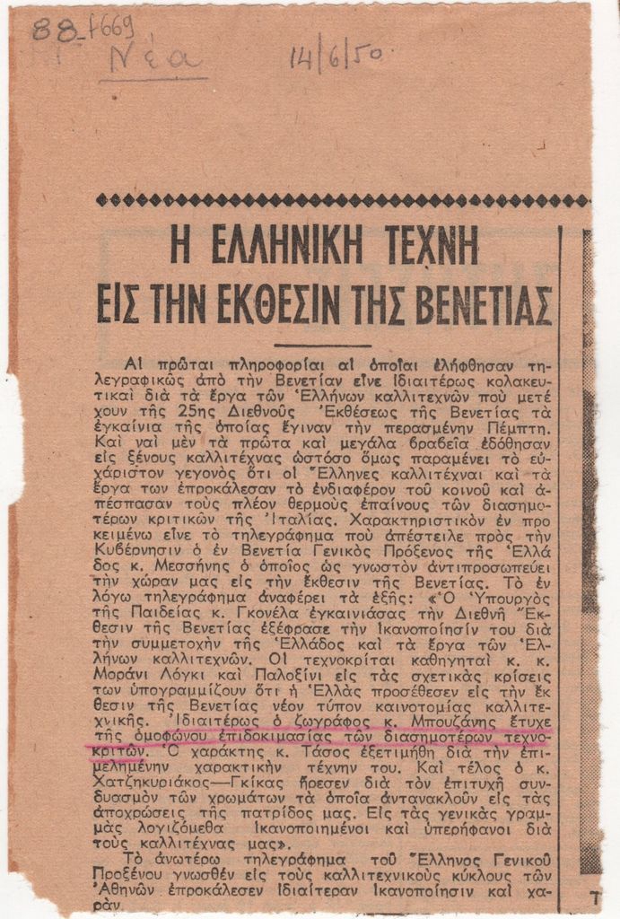 Απόκομμα, έντυπο, χαρτί, 13,8×9,0 εκ., όπου δημοσιεύεται, στα ελληνικά, άρθρο με τίτλο “Η ελληνική τέχνη εις την έκθεσιν της Βενετίας”, που αφορά στην υποδοχή της ελληνική συμμετοχής στην 25η Biennale της Βενετίας το 1950. Ιδιαίτερη αναφορά γίνεται στις συμμετοχές του Γιώργου Μπουζιάνη, του χαράκτη Τάσσου και του Ν. Χατζηκυριάκου-Γκίκα. Επάνω, επιγραφή με τα στοιχεία της δημοσίευσης.