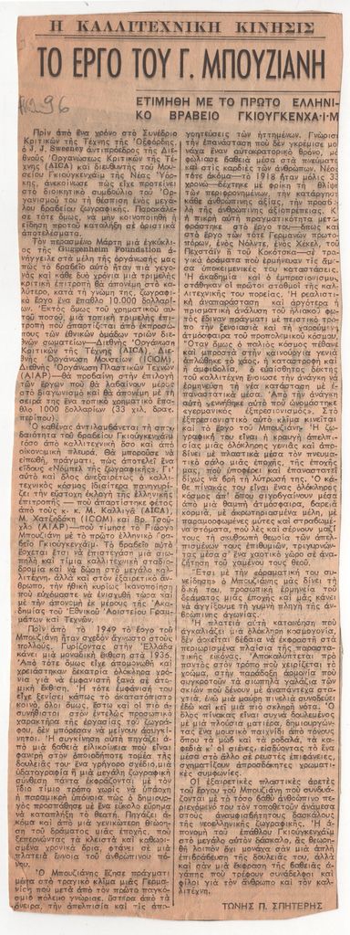 Απόκομμα, χαρτί, 27,2×10,0 εκ., όπου δημοσιεύεται, στα ελληνικά, άρθρο του Τώνη Σπητέρη για το έργο του Γ. Μπουζιάνη με αφορμή την απονομή στον καλλιτέχνη του ελληνικού βραβείου Salomon Guggenheim. Περιλαμβάνει κείμενο για το έργο του καλλιτέχνη. Εντάσσεται στη στήλη “Η καλλιτεχνική κίνησις”.