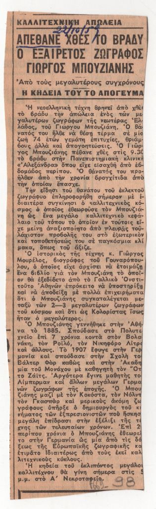 Απόκομμα, έντυπο, χαρτί, 17,5×5,0 εκ., όπου δημοσιεύεται, στα ελληνικά, η είδηση του θανάτου του ζωγράφου Γιώργου Μπουζιάνη. Κάτω, επιγραφή με την ημερομηνία της δημοσίευσης.