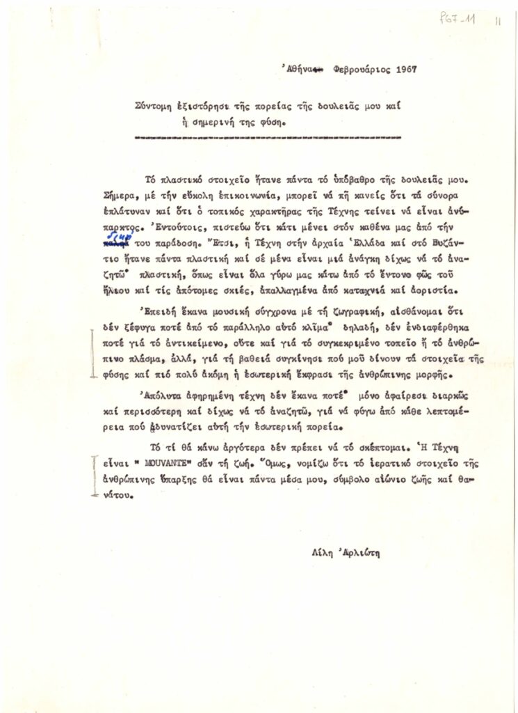 Κείμενο, δακτυλόγραφο, χαρτί, 28,7×20,5 εκ., στα ελληνικά, της Λίλης Αρλιώτη για το έργο της.