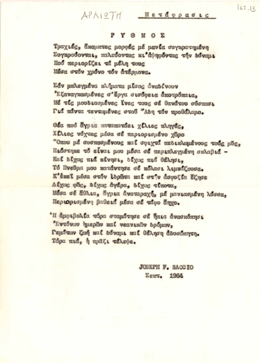Μετάφραση ποιήματος του Joseph Saccio, δακτυλόγραφο, χαρτί, 28×21 εκ., στα ελληνικά.