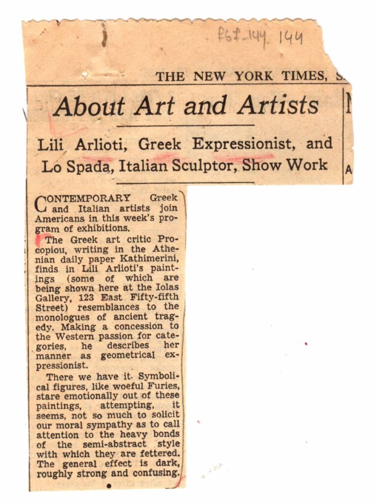 About Art and Artists. Lili Arlioti, Greek Expressionist, and Lo Spada, Italian Sculptor, Show Work