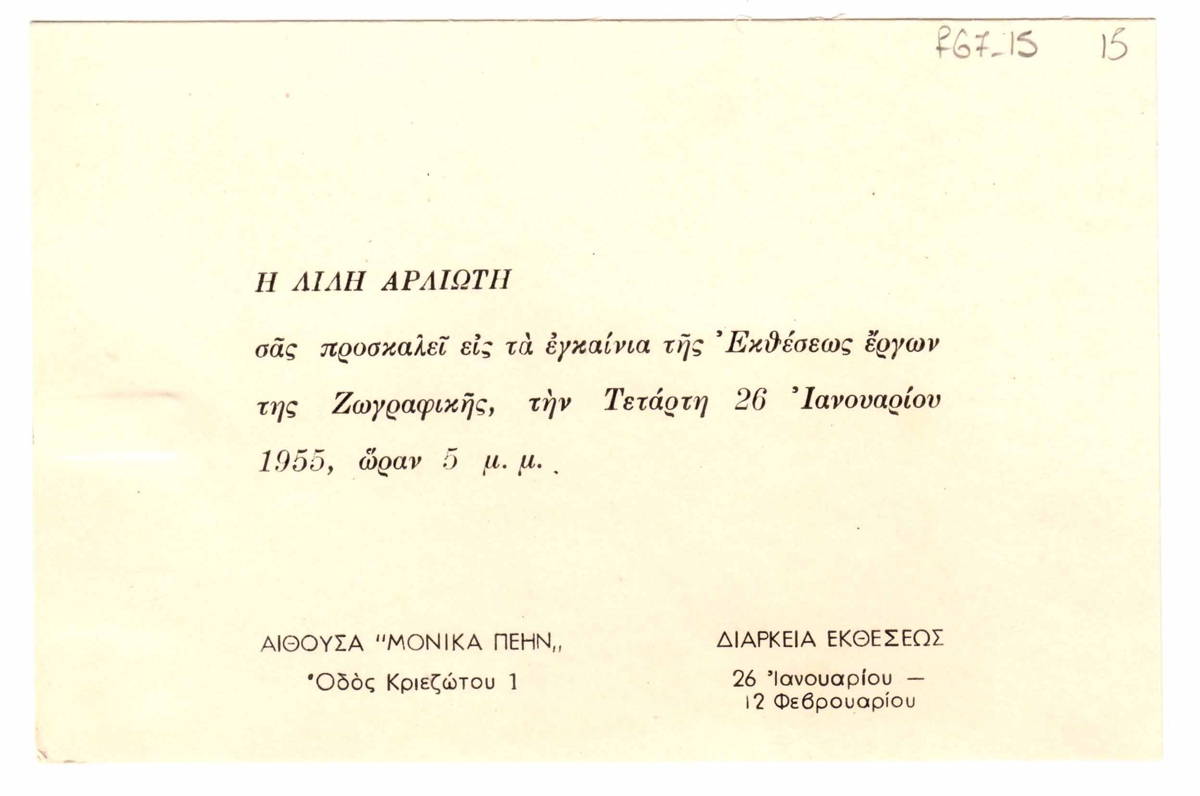 Πρόσκληση, χαρτόνι, 10×15 εκ., στα ελληνικά, εγκαινίων ατομικής έκθεσης της Λίλης Αρλιώτη.
