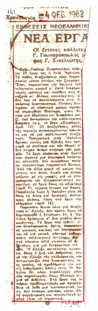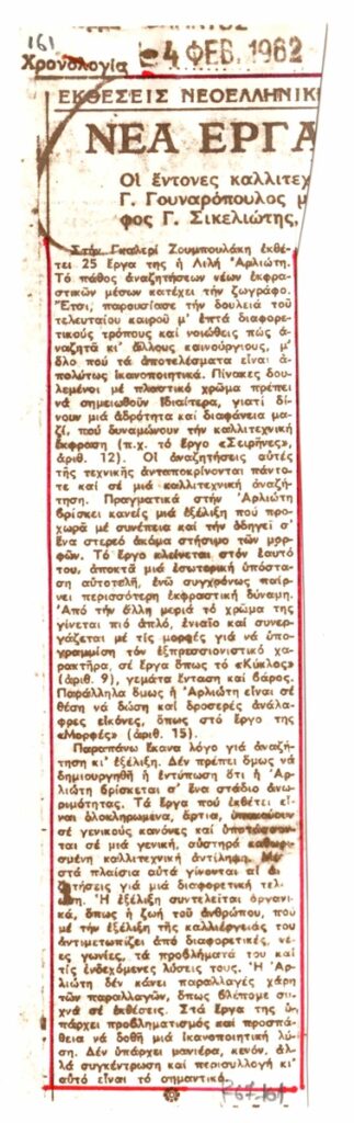 Φωτοαντίγραφο, χαρτί, 21×5,5 εκ., στα ελληνικά, δημοσίευσης κειμένου το οποίο αναφέρεται σε έκθεση της Λίλης Αρλιώτη στην γκαλερί Ζουμπουλάκη. Το κείμενο εντάσσεται στη στήλη “Εκθέσεις Νεοελληνικής…” και φέρει επιγραφές στο πάνω μέρος.