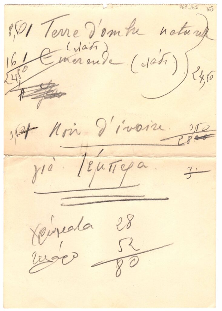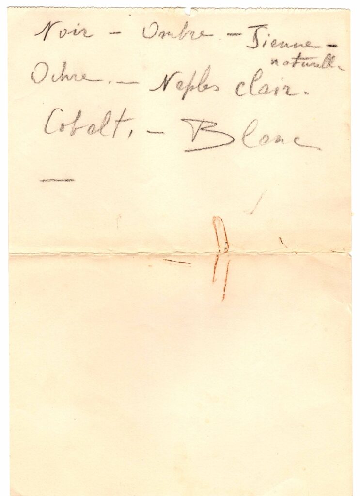 Χειρόγραφο σημείωμα, χαρτί διπλής όψεως, 28×19,5 εκ., σε γαλλικά και ελληνικά, με αναγραφόμενα υλικά, χρώματα και διαστάσεις έργου της Λίλης Αρλιώτη.