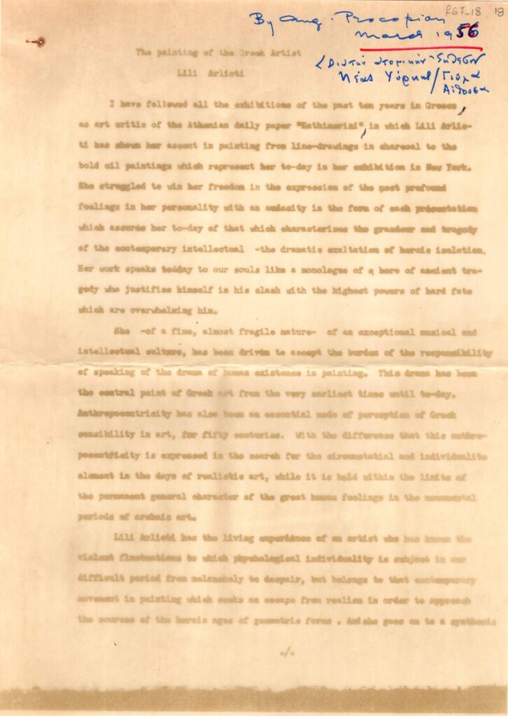 Φωτοαντίγραφο δακτυλόγραφου κειμένου, 2 φφ, 29,5×21 εκ., στα αγγλικά. Πρόκειται για κριτική έκθεσης της Λίλης Αρλιώτη η οποία διεξάγεται στην γκαλερί του Αλέξανδρου Ιόλα στη Νέα Υόρκη.