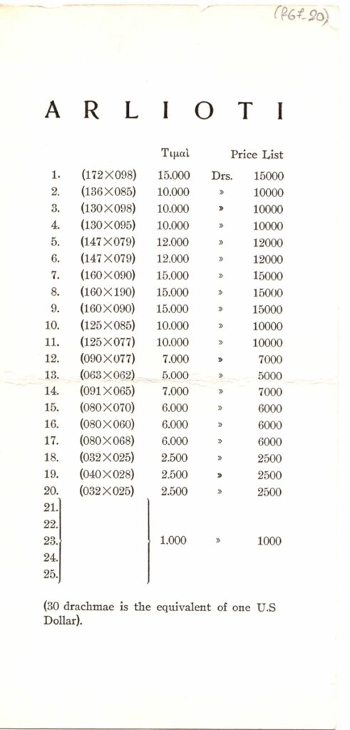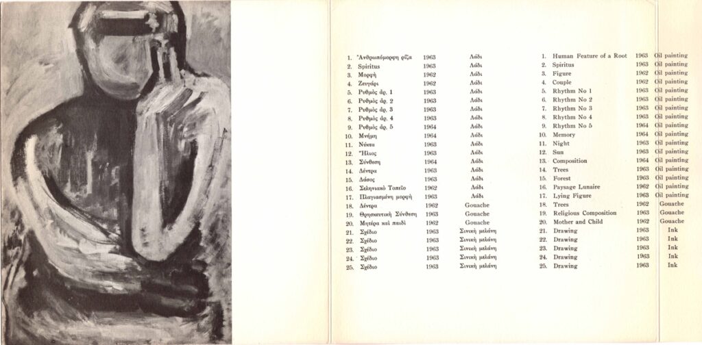 Έντυπο, χαρτόνι, τρίτπυχο με επιπλέον φύλλο, διαστάσεων 21×19,5 και 23×11 εκ. αντίστοιχα, στα ελληνικά με αγγλική παράλληλη μετάφραση. Περιλαμβάνει κείμενο του Δημήτρη Πικιώνη για την καλλιτέχνιδα, κατάλογο και τιμοκατάλογο έργων, βιογραφικό σημείωμα και εικονογράφηση.