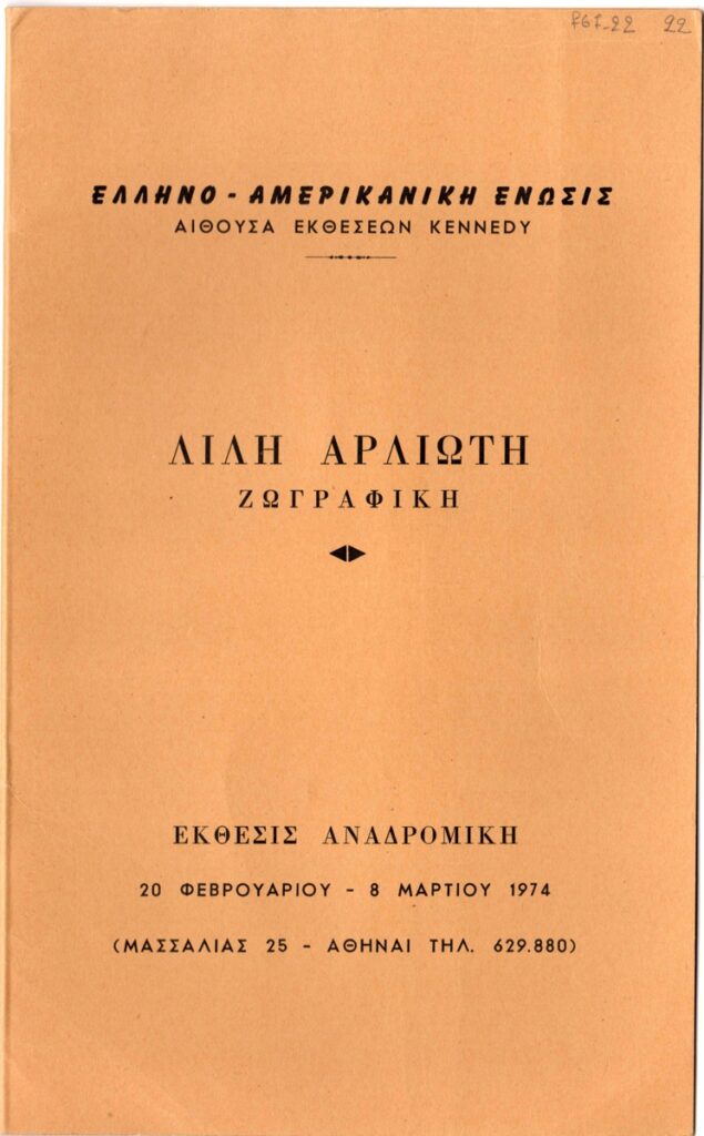 Κατάλογος, χαρτόνι αναδιπλωμένο, 27,5×16,5 εκ., στα ελληνικά, αναδρομικής έκθεσης της Λίλης Αρλιώτη. Συμπεριλαμβάνονται 44 έργα με χρονολογία δημιουργίας και διαστάσεις τους καθώς και αποφθέγματα “Η ύλη… τιπ’ άλλο από σχήμα ονείρων ασύλληπτων” του G. Bachelard και “Η Ζωή μας δεν είναι παρα σύμβολα και όνειρα” του P. Renan.