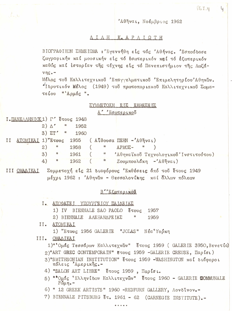 Βιογραφικό, δακτυλόγραφο, χαρτί, 2 φφ, 28×21 εκ., στα ελληνικά της Λίλης Αρλιώτη. Περιέχει προσωπικά στοιχεία και λίστα με συμμετοχή σε εκθέσεις εσωτερικού και εξωτερικού.