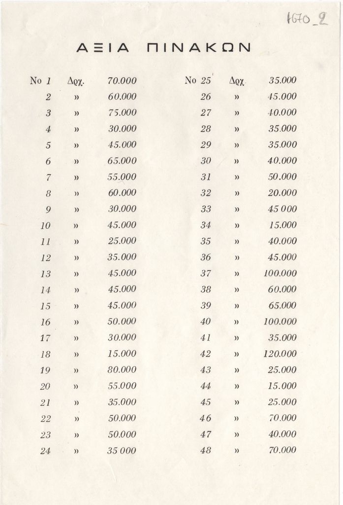 Έντυπο, στα ελληνικά, μονόφυλλο, χαρτί, 21,4×14,4 εκ. Τιμοκατάλογος έργων ατομικής έκθεσης. Βρέθηκε στον φάκελο της ζωγράφου Δώρας Μπούκη.