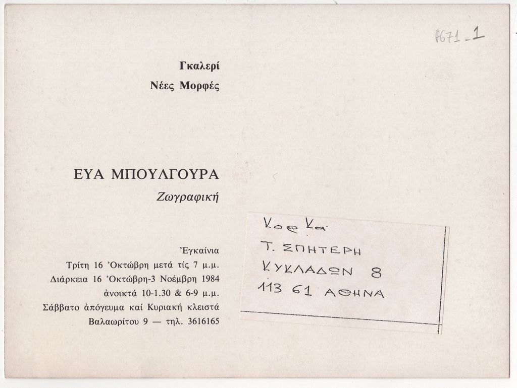 Έντυπο, στα ελληνικά, μονόφυλλο, χαρτί ιλουστρασιόν, 13,0×17,5 εκ. Πρόσκληση της ατομικής έκθεσης της Εύας Μπουλγουρά στην Αθήνα το 1984. Στην μία όψη, εικονογράφηση. Στην άλλη όψη, αυτοκόλλητη ετικέτα με τα στοιχεία του ζεύγους Σπητέρη ως παραλήπτες.