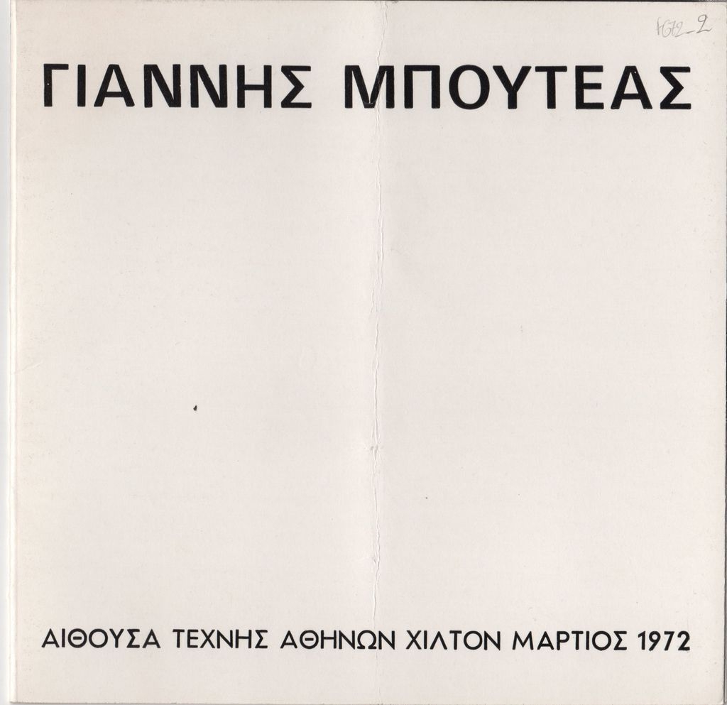 Έντυπο, στα ελληνικά και αγγλικά, χαρτόνι ιλουστρασιόν, 16,5×16,5 εκ. Κατάλογος της ατομικής έκθεσης έργων του Γιάννη Μπουτέα στην Αθήνα τον Μάρτιο του 1972/ Περιέχει σύντομο βιογραφικό του καλλιτέχνη και κείμενο του Δ. Α. Φατούρου με τίτλο “Καταγραφή μερικών γνωρισμάτων του έργου του Γιάννη Μπουτέα” γραμμένο τον Φεβρουάριο του 1972″. Εικονογραφείται με αναπαραγωγή έργων.