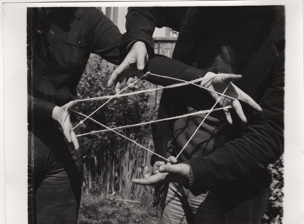 Φωτογραφία, α/μ, σε φωτογραφικό χαρτί, 17,8×13,0 εκ. Ο εικαστικός Γιάννης Μπουτέας με μία γυναίκα δημιουργούν σχηματισμούς με κορδόνι.