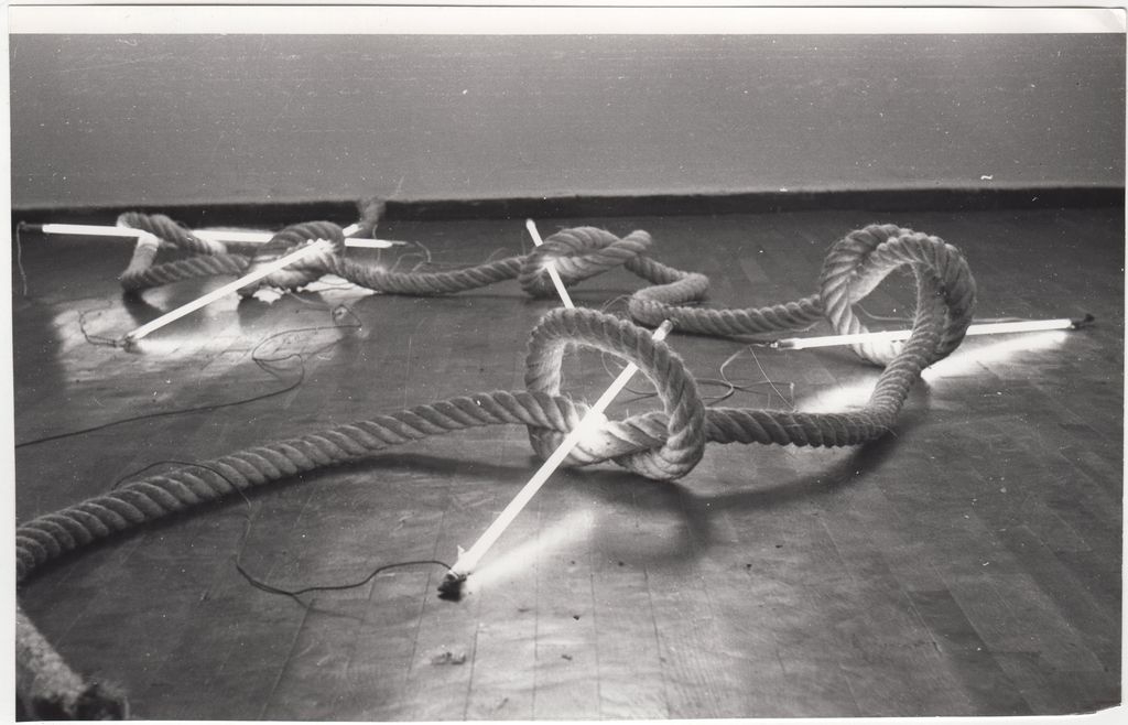 Φωτογραφία, α/μ, σε φωτογραφικό χαρτί, 14,6×22,8 εκ. Φωτογραφία έργου του Γιάννη Μπουτέα τοποθετημένο σε εκθεσιακό χώρο.