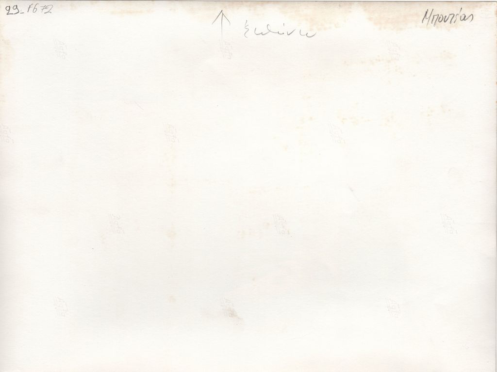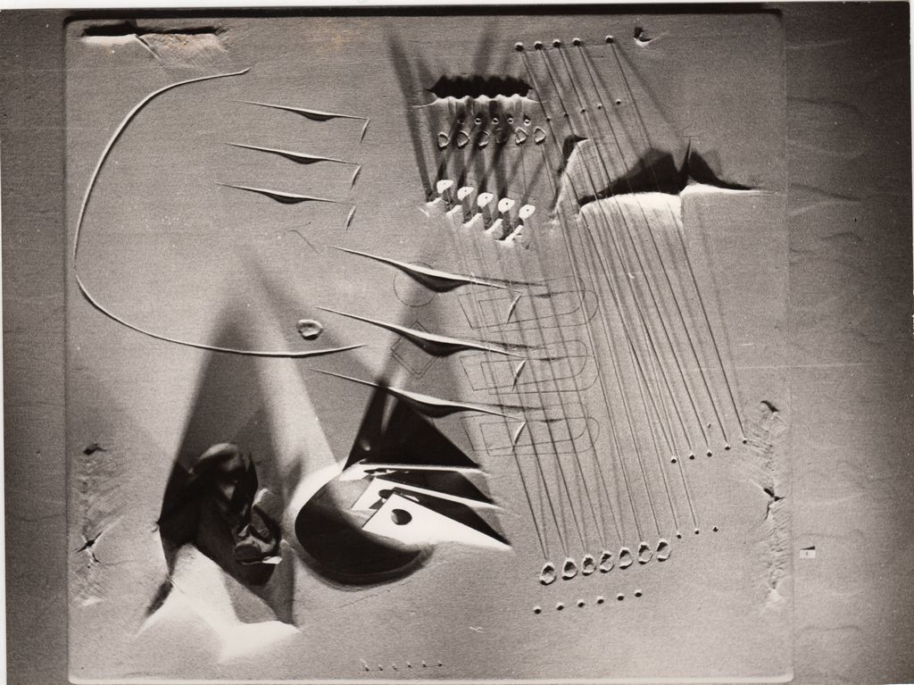 Φωτογραφία, α/μ, σε φωτογραφικό χαρτί, 18,0×24,0 εκ. Αναπαραγωγή έργου του Γιάννη Μπουτέα τοποθετημένου σε εκθεσιακό χώρο. Στην πίσω όψη, επιγραφή.