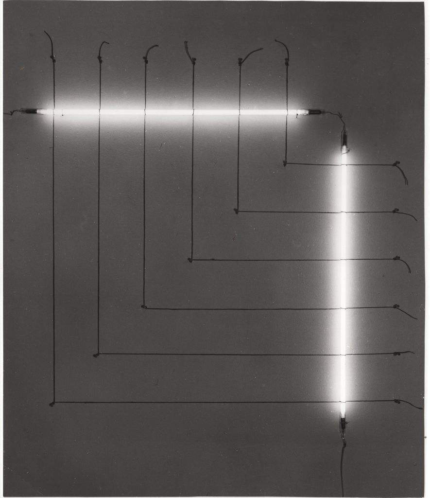 Φωτογραφία, α/μ, σε φωτογραφικό χαρτί, 23,0×19,5 εκ. Αναπαραγωγή του έργου του Γιάννη Μπουτέα από τη σειρά “Μεταπλάσεις” (νέον, σπάγγος), α/μ. Στην πίσω όψη, επιγραφή.