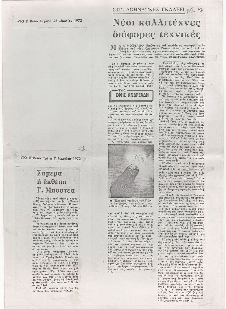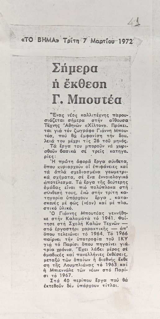Φωτοαντίγραφο αποκόμματος, σε χαρτί, 12,5×6 εκ., όπου δημοσιεύεται, στα ελληνικά, η είδηση των εγκαινίων της ατομικής έκθεσης του Γιάννη Μπουτέα στην Αθήνα τον Μάρτιο του 1972. Περιλαμβάνει σύντομο βιογραφικό καλλιτέχνη. Επάνω, δακτυλόγραφη, σημείωση, στα ελληνικά με τα στοιχεία της δημοσίευσης.